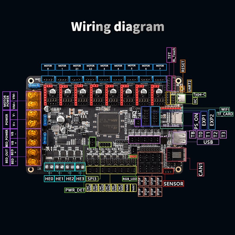 • 【Motherboard Expansion Function】Support BLTouch, locked-rotor detection, shutdown after printing, resume printing after power failure, CAN bus, U disk function, IIC expansion; at the same time reserved WIFI interface, PT100 thermistor interface (optional, Only reserved interfaces, customers need to purchase chip welding, please pay attention.), dual Z-axis printer.