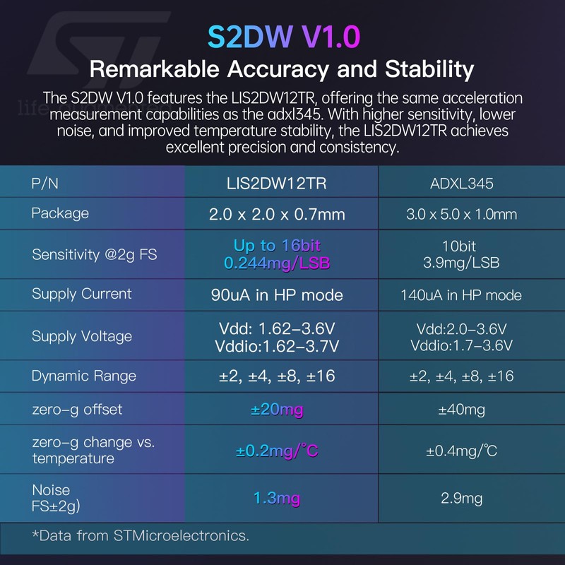 - 【Remarkable Accuracy and Stability】The S2DW V1.0 features the LIS2DW12TR, offering the same acceleration measurement capabilities as the adxl345. With higher sensitivity, lower noise, and improved temperature stability, the LIS2DW12TR achieves excellent precision and consistency. *Data from STMicroelectronics.