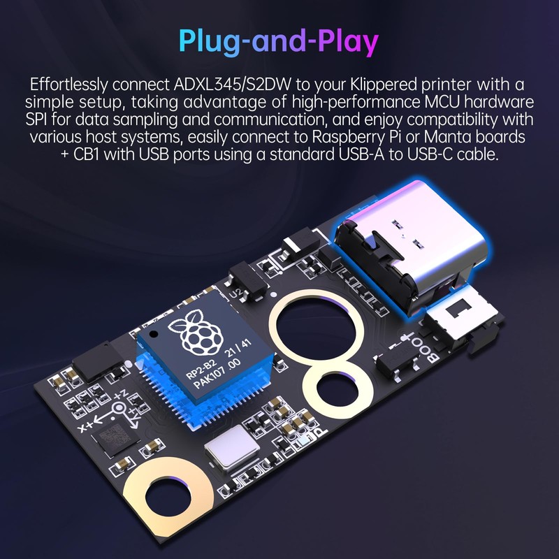 - 【Plug-and-Play】Effortlessly connect S2DW to your Klippered printer with a simple setup, taking advantage of high-performance MCU hardware SPI for data sampling and communication, and enjoy compatibility with various host systems, easily connect to Raspberry Pi or Manta boards + CB1 with USB ports using a standard USB-A to USB-C cable.