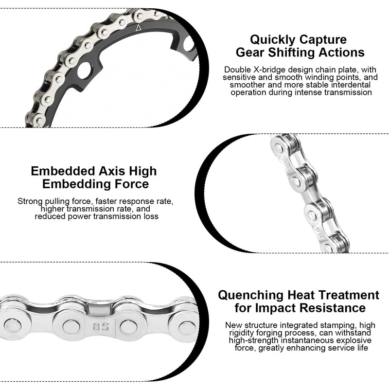 • 【Double-X Bridge Design】Our bicycle chain features a double-X bridge design, which makes the chain contact point more sensitive, can quickly detect gear changes, and runs smoother and more stable. In addition, the built-in shaft of the bicycle chain has a large embedding force, strong tensile force, faster response rate, and higher transmission rate, reducing power transmission loss.