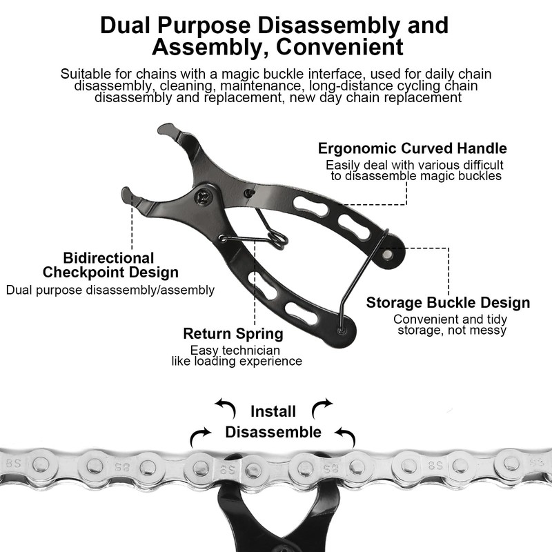 • 【Easy to Use】 The chain joint is a magic buckle that can be easily removed or installed on the bike connector. Simply align everything correctly, push out the pins, and remove the links. Then reassemble the chain, align everything, and rotate the sprockets to ensure the chain is securely connected.