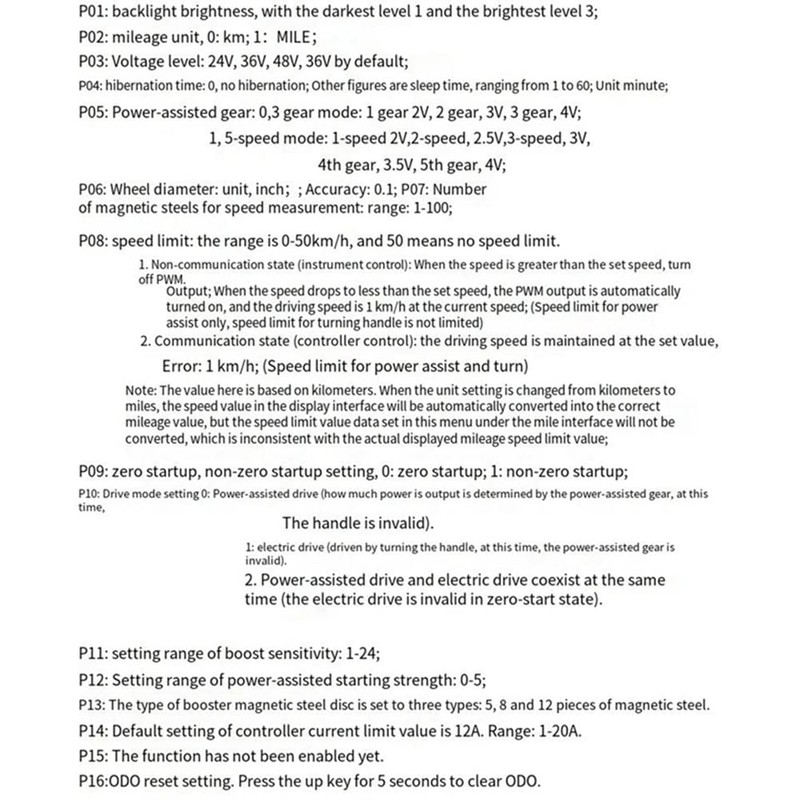 P08: Speed Limit: Range: 0-50km/h, parameter 50 indicates no speed limit.