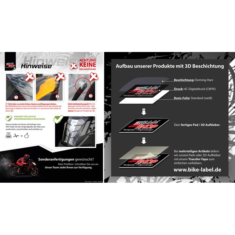 Our pads for the side tank area from BIKE-label protect your paint from unsightly scratches caused by clothing, zips, buckles, stone flight or other mechanical influences. The pads are self-adhesive and easy to apply.