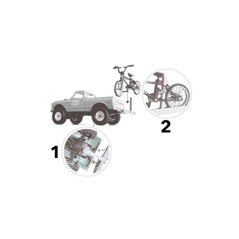 Rear Mount Version: Attaches directly to the rear chassis rails using two included screws. Comes with two miniature bikes in black and orange.