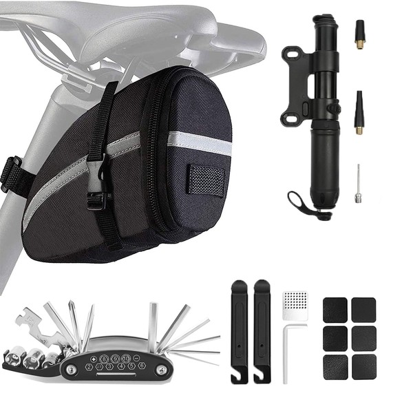 - 【Multi-Function Bike Repair Kit】This Bicycle Saddle Bag under the seat comes with a 16-in-1 bike repair tool,1 Mini Bike Pump, 3 traces, 2 tire levers, 6 glue-free tire patches, and a tire pieces, which can help to fix most problems of bikes. Great value-for-money suit.