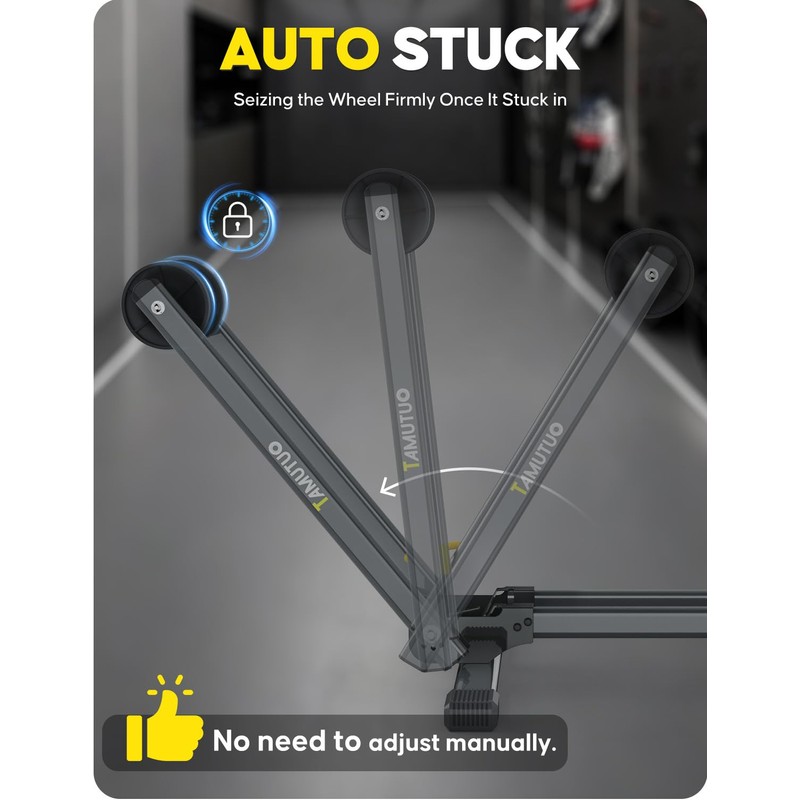 - Glide bikes in/out effortlessly: Auto-adjusts to tire size—no tools or manual adjustments needed. Dual bars automatically lock upon insertion, ideal for users with bikes. 2.55" (6.5cm) slots securely lock 16-29" wheels, including 700C road bikes. Thanks to the latest dual rod spring arm, the symmetrical design ensures balanced weight distribution for Road Bike/Mountain Bike parking stability to avoid tipping during bike push in and pull out.