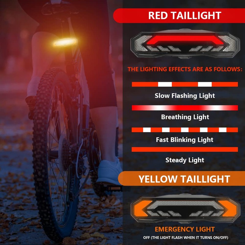 • 🚩5 In 1 Smart Bike Tail Light: It is worth mentioning that this bicycle turn signal has five functions: warning light/brake light/turn light/electric bell/anti-theft alarm. It can remind pedestrians and vehicles around in all directions, effectively protecting the safety of cars and riders. The rear bike light has a built-in 2000mAh high-capacity rechargeable battery. After 7 hours of full charge, the bike tail light can work for 70 hours.