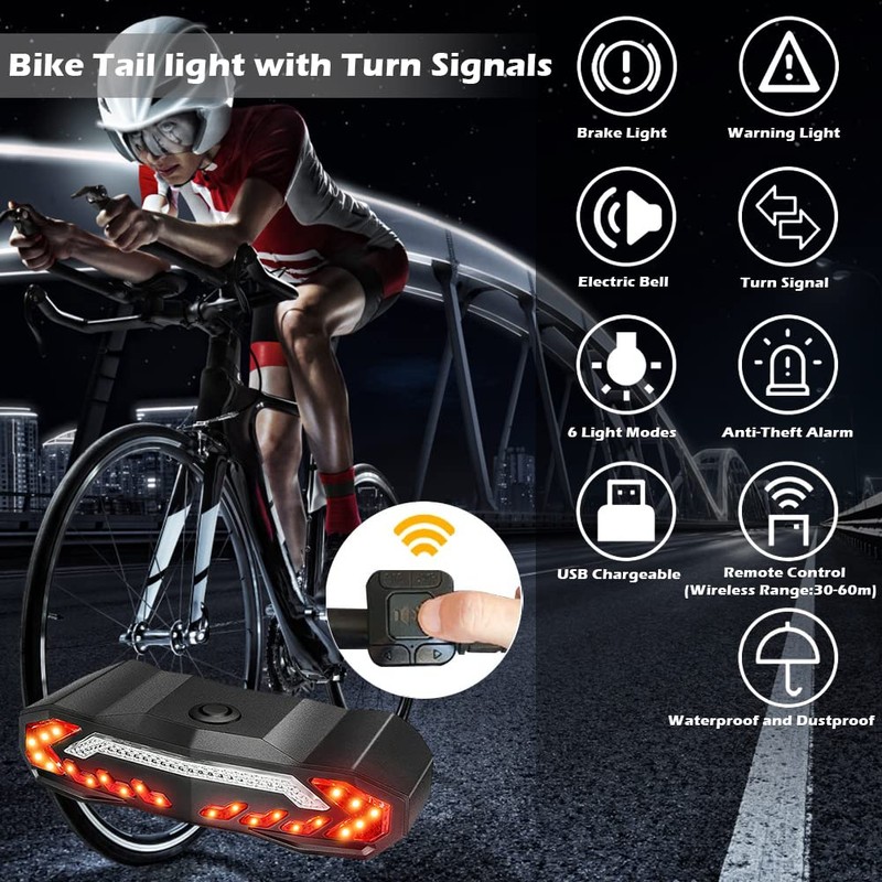 Bike Tail light with Turn Signals Ultra Bright Bike Rear Light Rechargeable with Remote Control Automatic Safety Warning Bike Brake Lights with Electric Bell Function