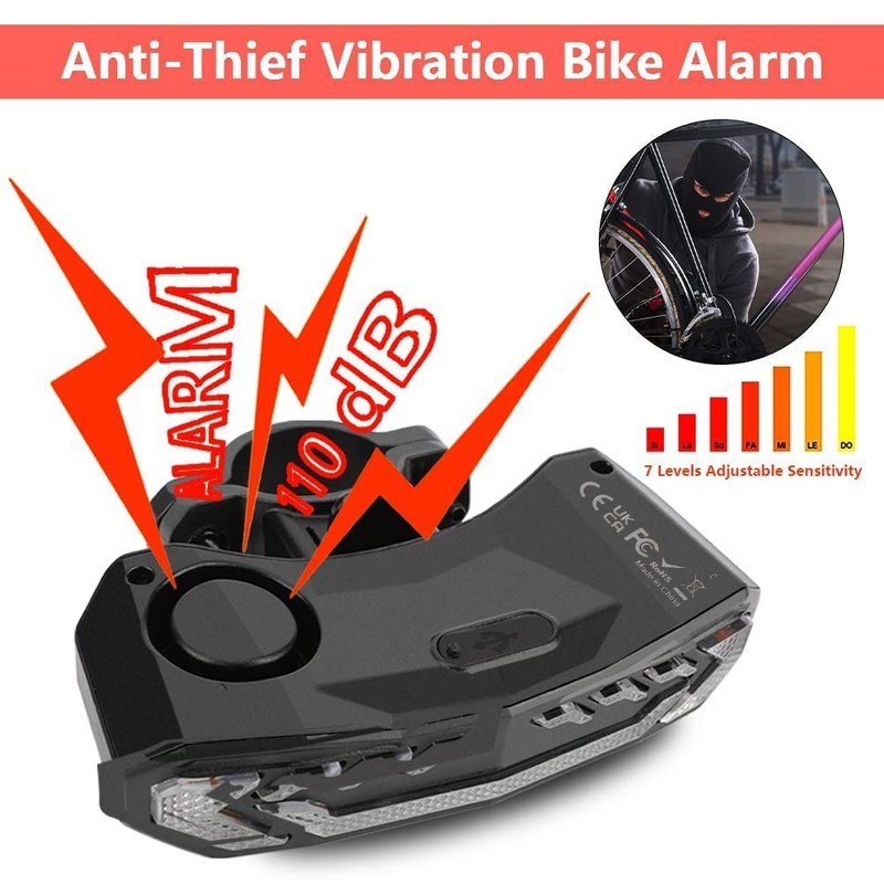 • 🚴Anti-Theft Bicycle Alarm:The tail light bike can emit loud sounds and vibrations, and the 110DB loudness can effectively scare away thieves and protect your bicycle. In the state of armed alarm, if you touch or knock the bicycle, the host will issue a 2 second warning; If you touch or knock again within 2-12 seconds, the host will issue a 30-second continuous alarm to stop the thief. 7 levels of adjustable sensitivity, from light touch to push or knock.