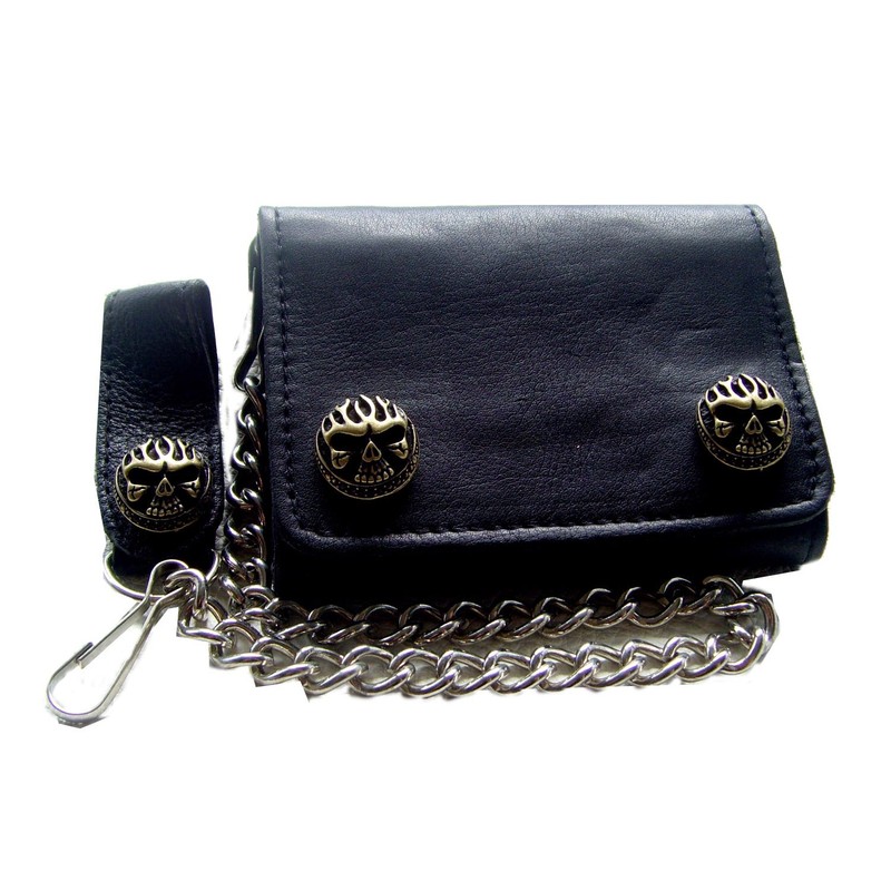 Biker Leather Wallet Leather Bad Skull Brass Colour Black with Chain and Loop, black, Skull modern