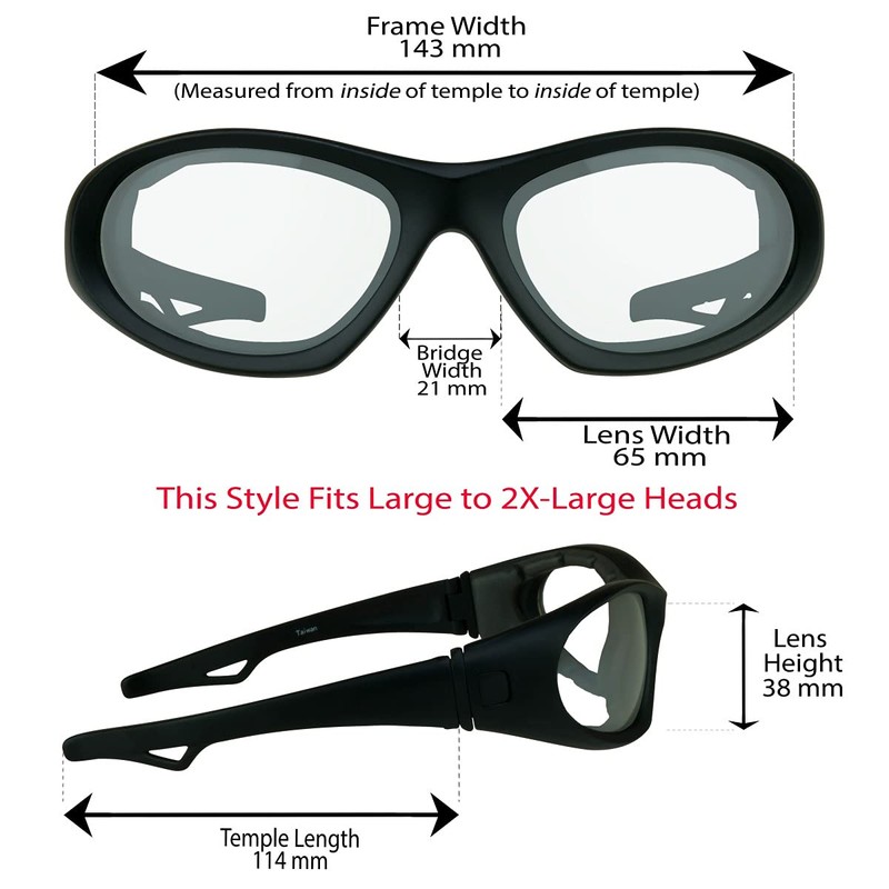 If you're having a hard time finding wide fit motorcycle sunglass goggles for big head sizes, look no further - the Down Force foam padded motorcycle sunglasses are the perfect pair for you!