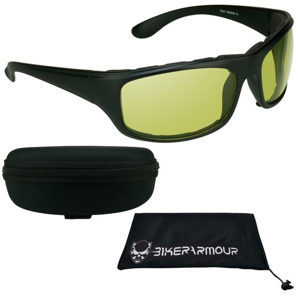 - PHOTOCHROMIC LENSES: Tired of getting stuck at night without a pair of clear riding glasses? When exposed to sunlight, these biker glasses with BikerArmour Eclipse Photochromic technology transition from totally clear to gray in a matter of seconds. Or choose lenses that change from yellow to rustic brown. Yellow lenses help eliminate the “halo effect” around lights at night.