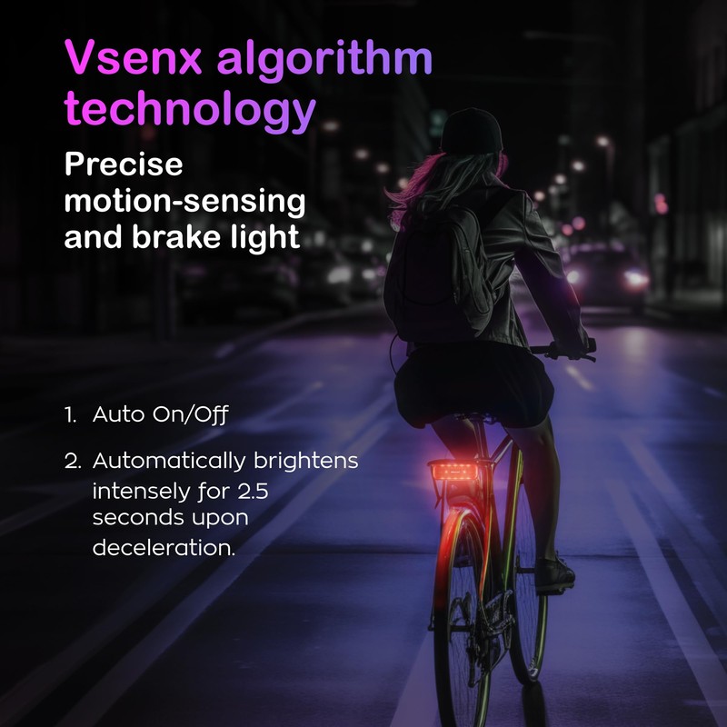 - Upgrade Your Reflector to BKS-G4R Now! - BikeSpark’s Auto-Sensing Rear Lights detect bike deceleration with an innovative deceleration sensing algorithm, Vsenx (US Patent No.: 10427594 B2). Once deceleration is detected, BikeSpark increases the brightness to ultrabright for 2.5 seconds, alerting and improving the reaction time of the person in any vehicle traveling behind.