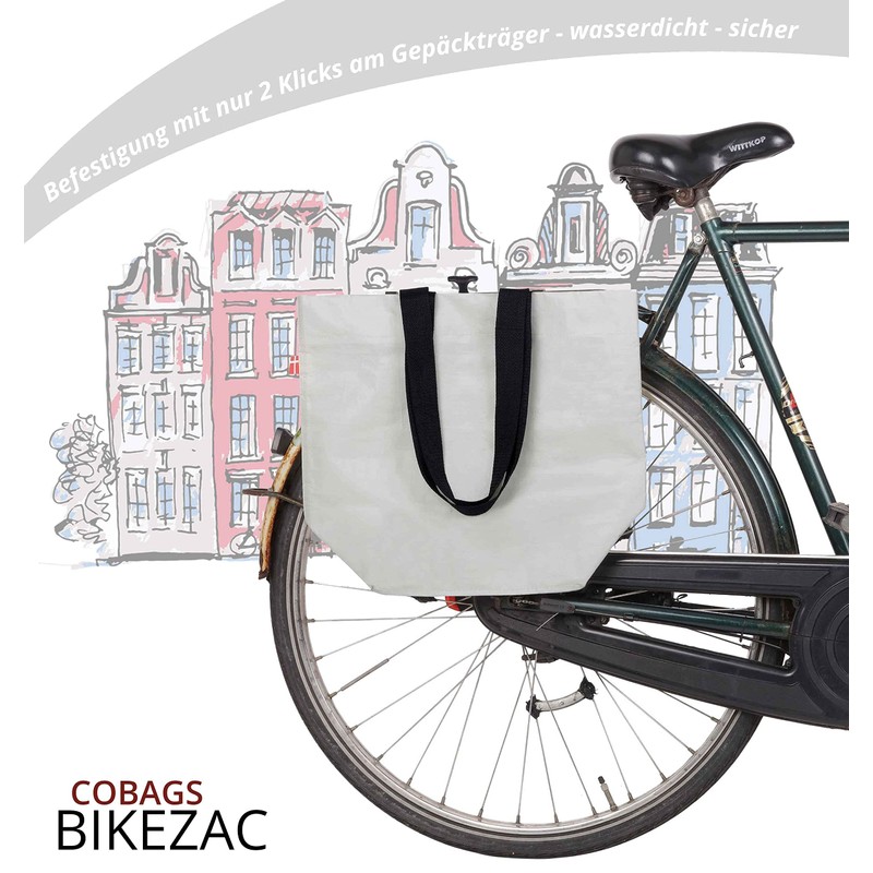 - Practical and simple: the BikeZac 2.0 is the perfect companion for shopping. Thanks to the innovative and COBAGS patented mounting rail, the shopping bag can be attached to the pannier rack with just 2 clicks. The integrated elastic band is used to close the bag, which serves for safe transport of the contents. To remove, you only need to pull the T-shaped handle briefly and can store the bag folded into the actual bag when not in use.