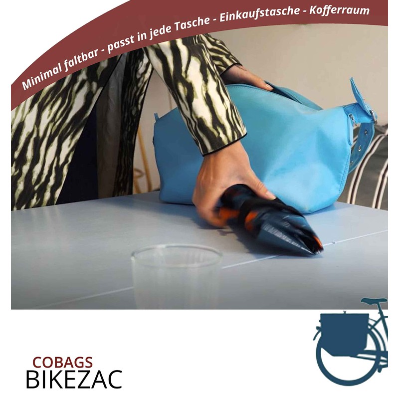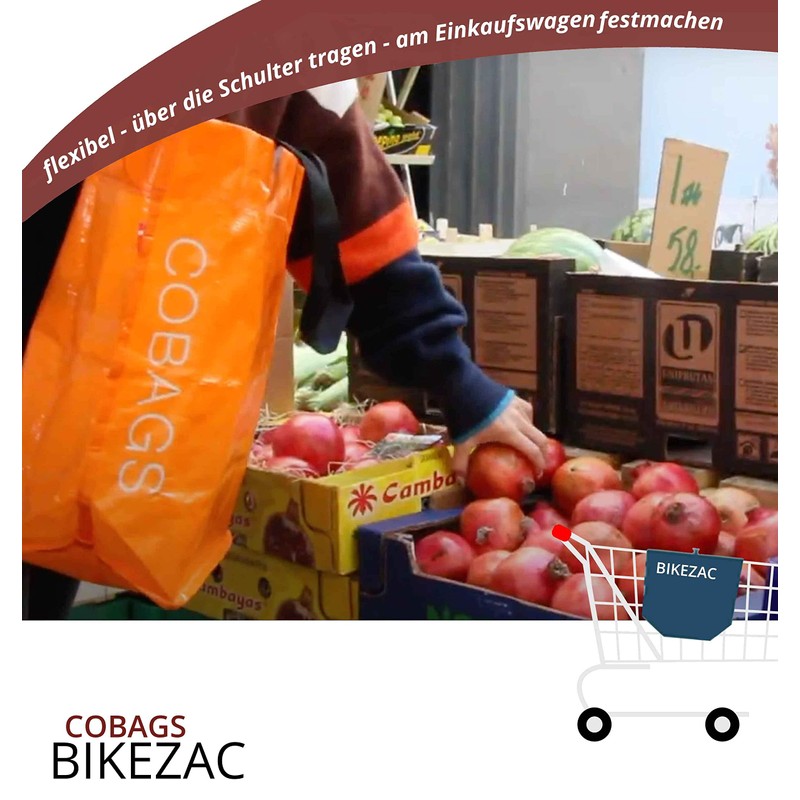 - Practical and simple: the BikeZac 2.0 is the perfect companion for shopping. Thanks to the innovative and COBAGS patented mounting rail, the shopping bag can be attached to the pannier rack with just 2 clicks. The integrated elastic band is used to close the bag, which serves for safe transport of the contents. To remove, you only need to pull the T-shaped handle briefly and can store the bag folded into the actual bag when not in use.