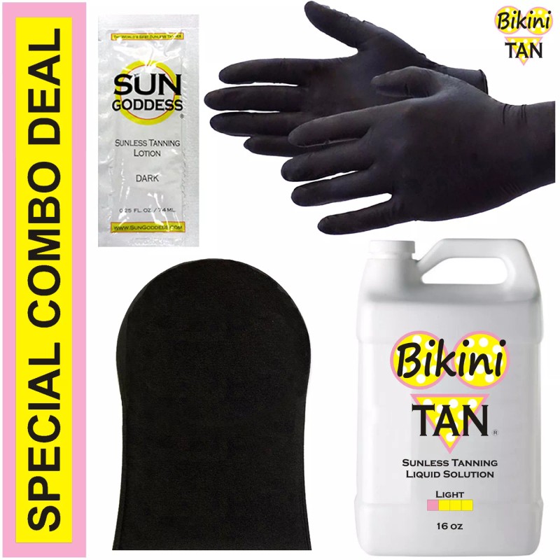 Bikini Tan has created this amazing new Sunless Self Tanning Liquid Spray Tan Solution. It can be used in any airbrush spray tanning system or in any professional spray tanning booth or it can also be applied by hand with our Bikini Tan sunless self tanning application mitt and gloves which are included for FREE! Our light shade sunless self tanning liquid spray tan solution dries almost instantly and will give you a beautiful golden-brown tan that will last up to 10 days.