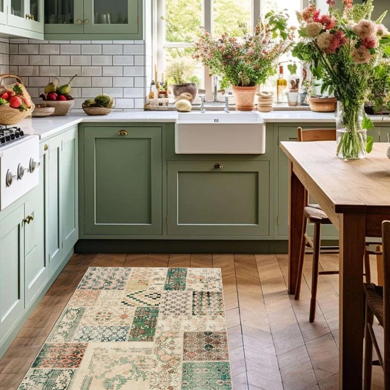BILEEHOME Boho Kitchen Rug Washable,4x6 Non Slip Small Area Rug for Bathroom Bedroom Indoor Entrway Ultra Thin Fit Under Door,Light Tan Beige Brown and Dark Green Rust Burnt Orange