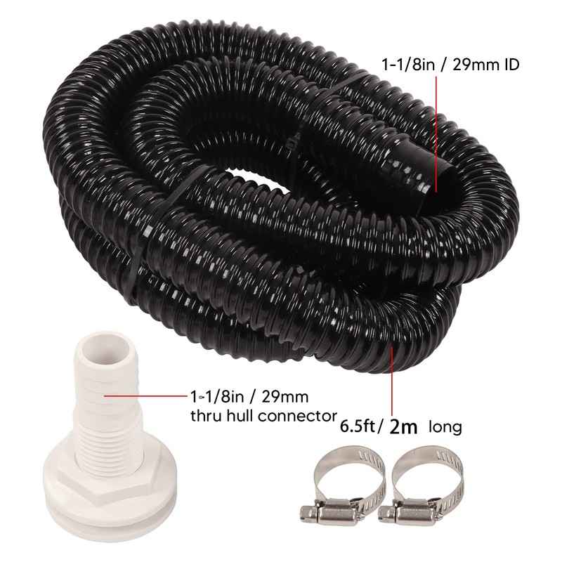 Kit Includes: 1pc 6.6ft / 2m 1-1/8in / 29mm ID (inside diameter) PVC hose, 2pcs stainless steel gear hose clamps, 1pc 1-1/8in thru hull connector