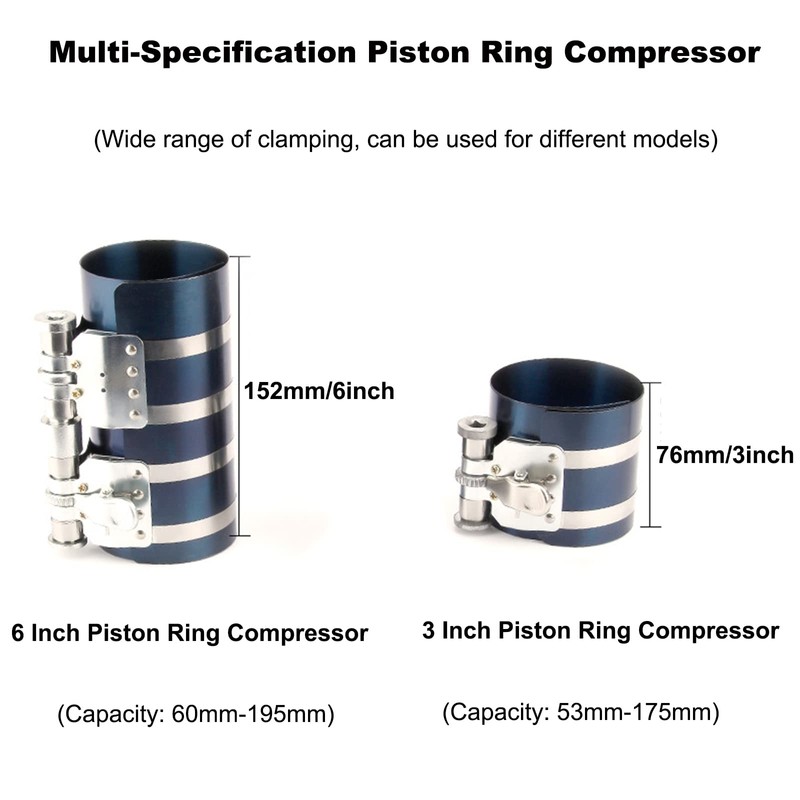 - 6 inch piston ring compressor, adjustable ring diameters ranging in thickness from 2.4 inch to 7.6 inch (60mm to 195mm), which has good protection performance, and will not cause damage to parts during installation.