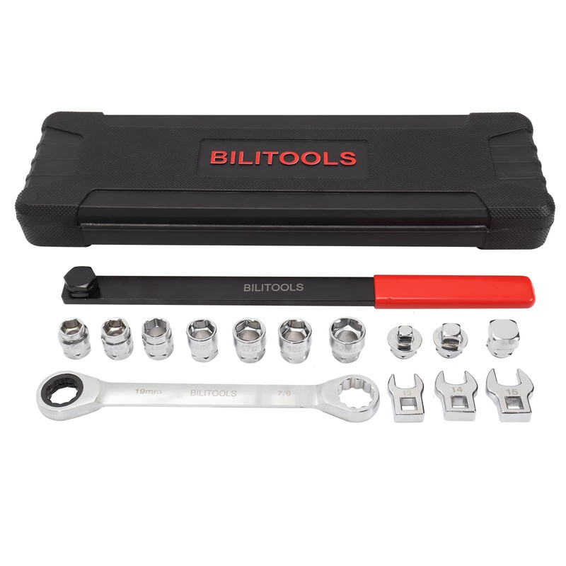 BILITOOLS 15-Piece Universal Serpentine Belt Tool Set,Belt Tensioner Tool Kit with Ratcheting Wrench, Crowfoot Wrenches, Socket Adapters.19 mm and 7/8'' ratchet drive.