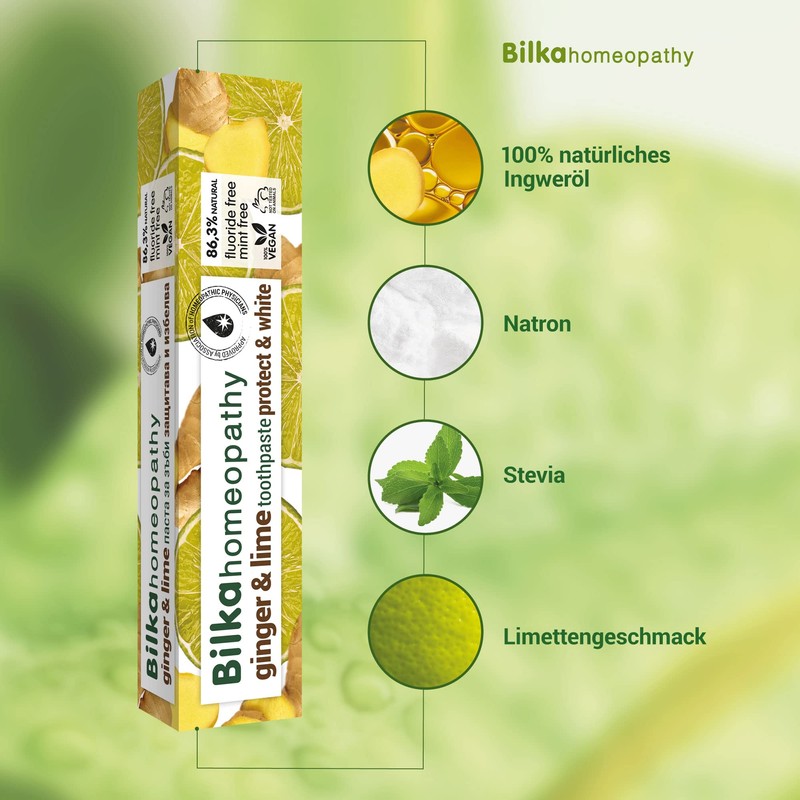 - Freshness from nature - The green lime contributes to the fresh aroma of the Bilka Homeopathy ginger and lime toothpaste