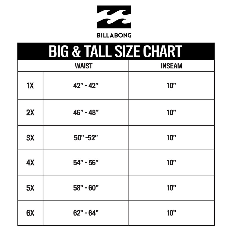 - BILLABONG MENS BOARDSHORTS 10in INSEAM – Made from high performance quality fabric, this Billabong big and tall boardshort boast a flattering fit and eye-catching design, ensuring you make a statement whether you're catching waves or soaking up the sun.