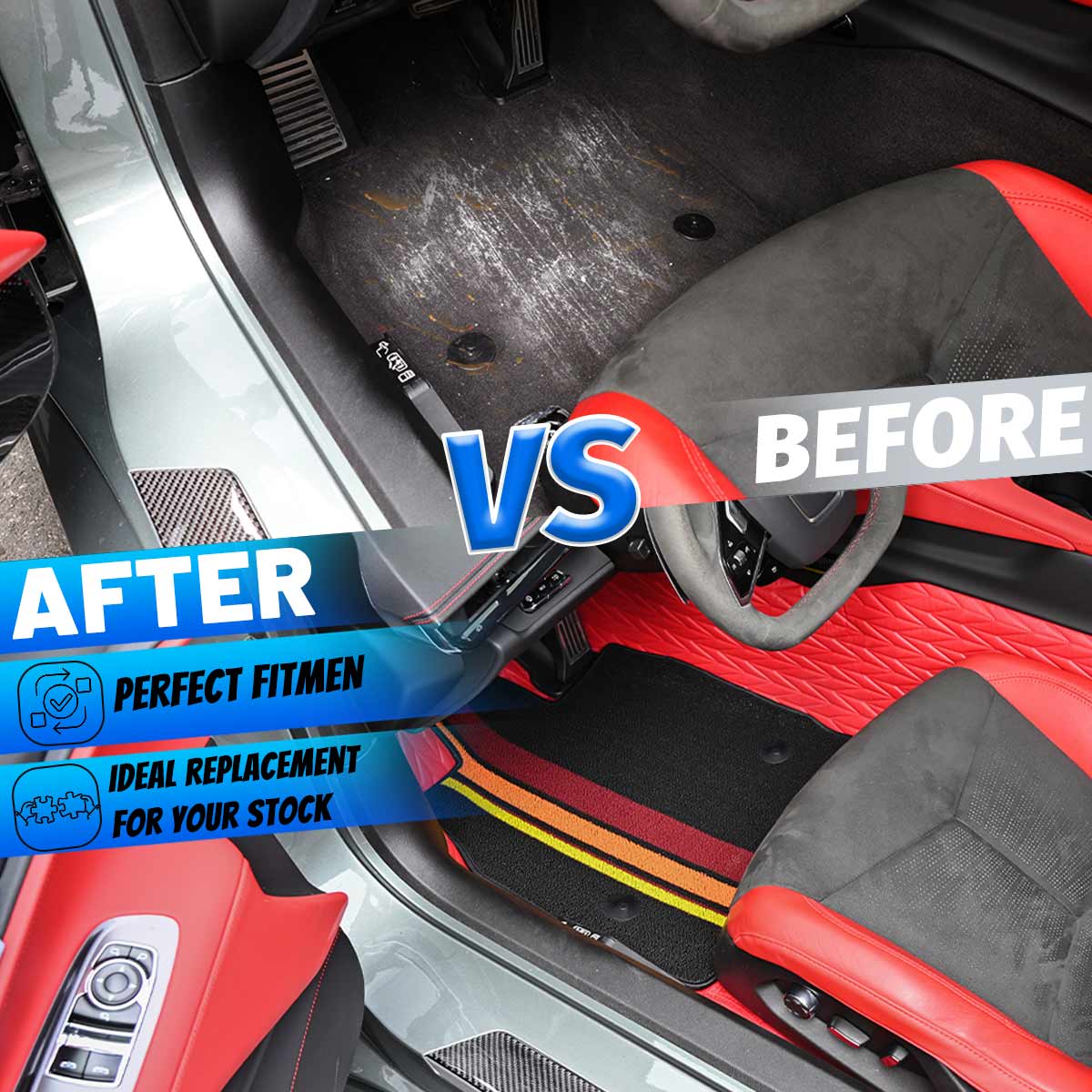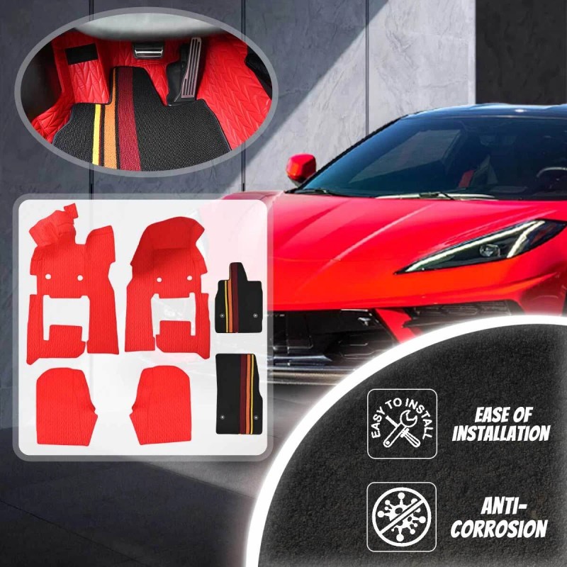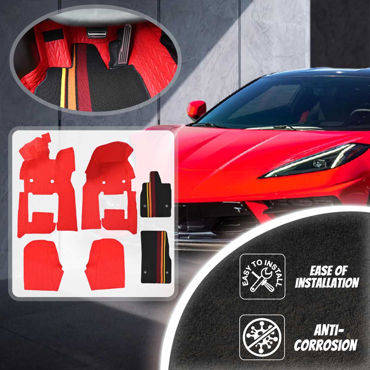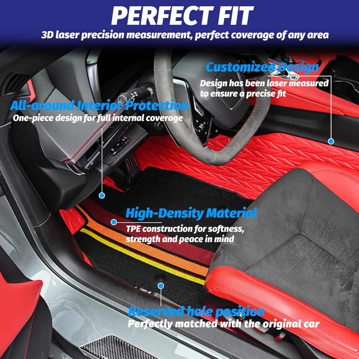 The floor mats set compatibility with for Corvette C8 Stingray 2020-2024 (It fit for Corvette C8 Stingray Coupe Convertible/HTC and Z06/Eray 2020-2024,Protect your C8 interior from water, debris, and wear and tear with these C8 Carpeted Floor Mats. The mats provide an additional layer of protection against dirt, water, and salt, while also preventing future wear and tear on your car's carpet.