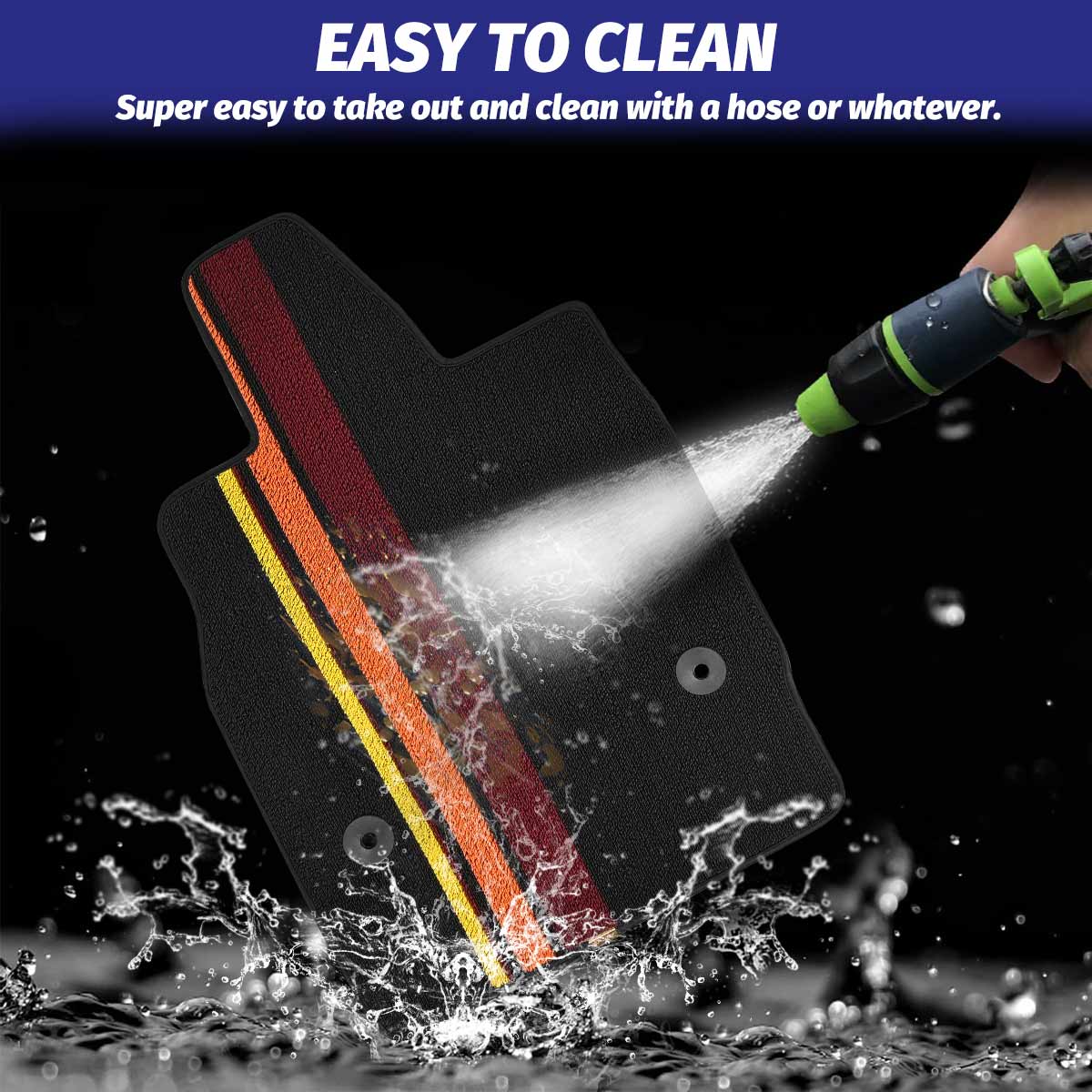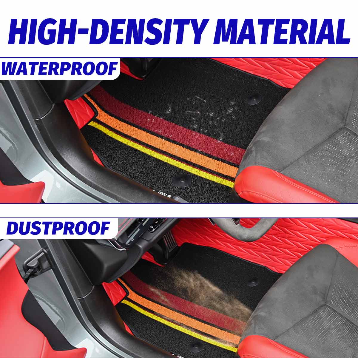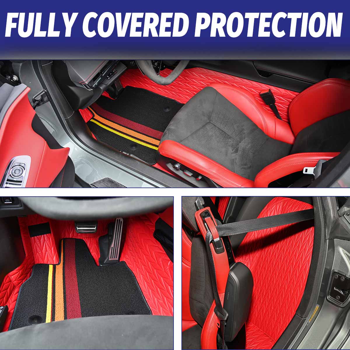 The floor mats set compatibility with for Corvette C8 Stingray 2020-2024 (It fit for Corvette C8 Stingray Coupe Convertible/HTC and Z06/Eray 2020-2024,Protect your C8 interior from water, debris, and wear and tear with these C8 Carpeted Floor Mats. The mats provide an additional layer of protection against dirt, water, and salt, while also preventing future wear and tear on your car's carpet.