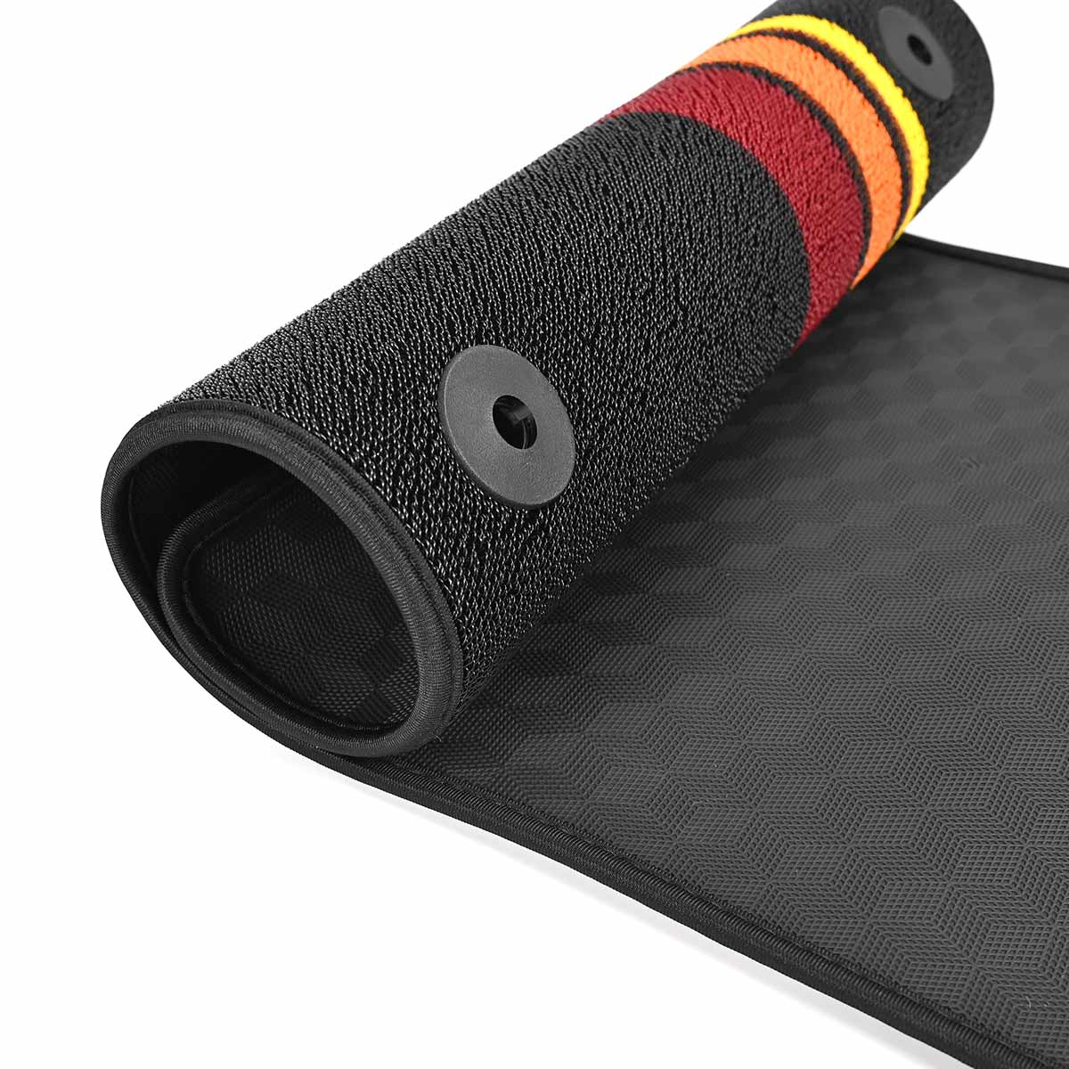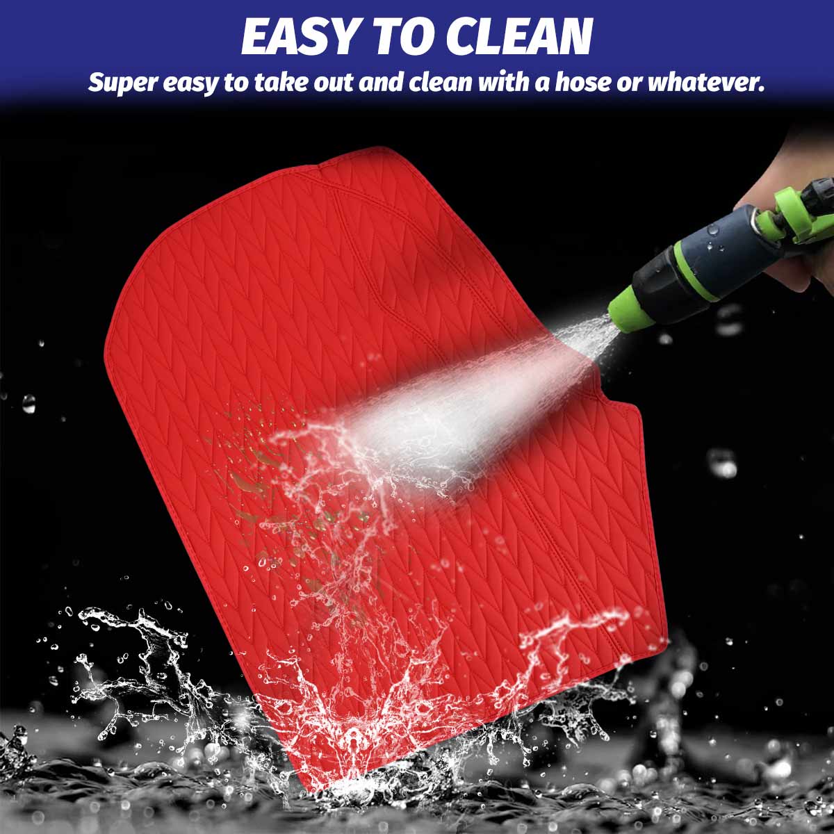 The floor mats is made of artificial leather material, provides a stiff core for high strength, as well as high-friction outer surfaces to grab your carpet and give your feet a tactile surface to scrape and kick. Their deep, multi-level channel design is a brilliant innovation that carries fluids away from your feet towards a reservoir trap,it lets you simply dump the reservoir over the door sill. Say so long to fumbling with your dirty floor mats and spilling on the carpet you're trying to protect!