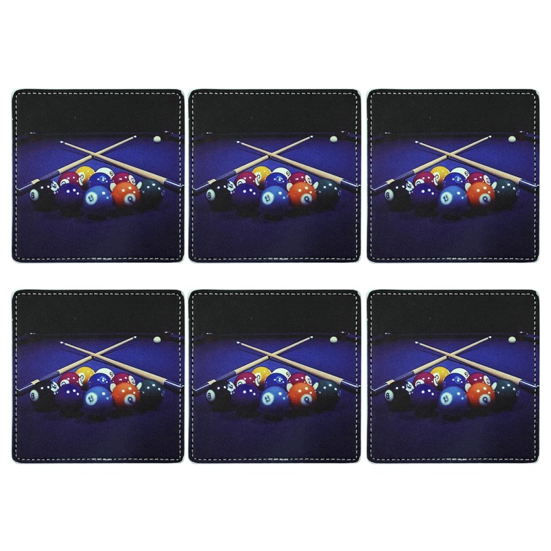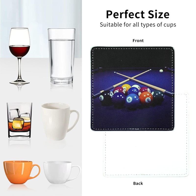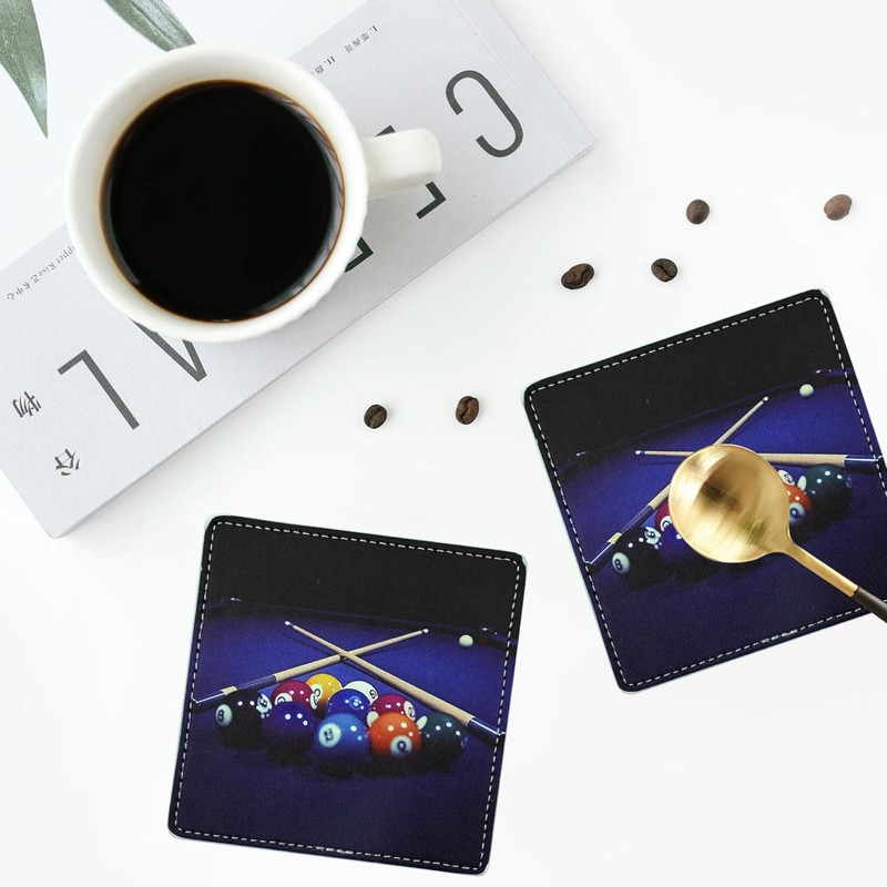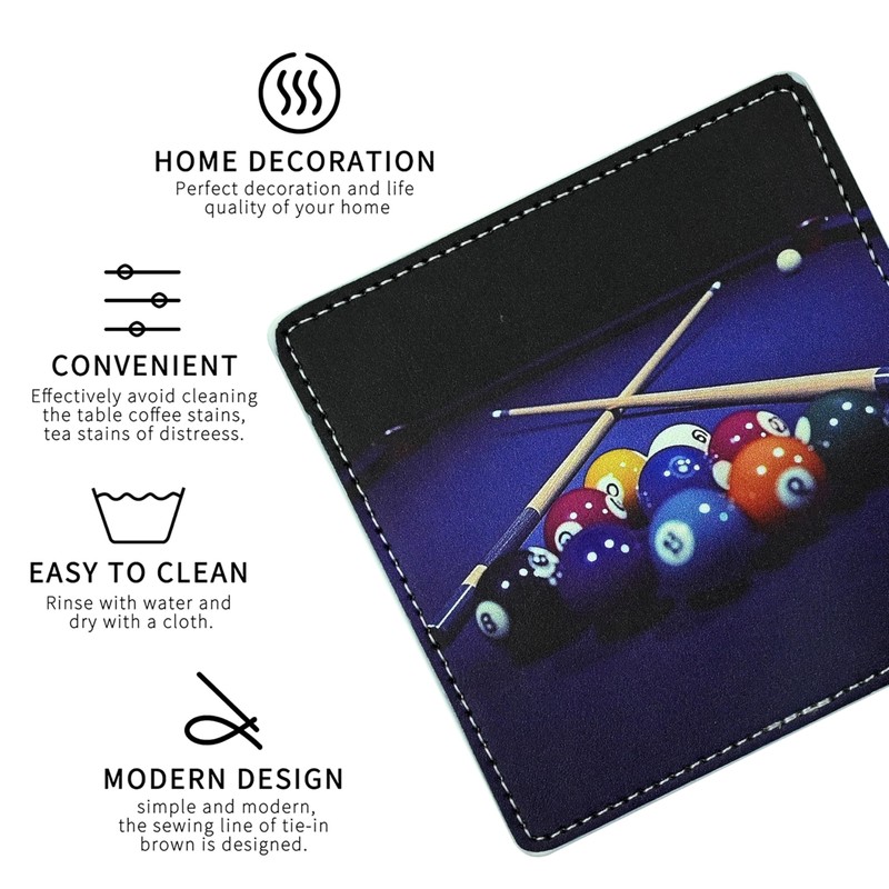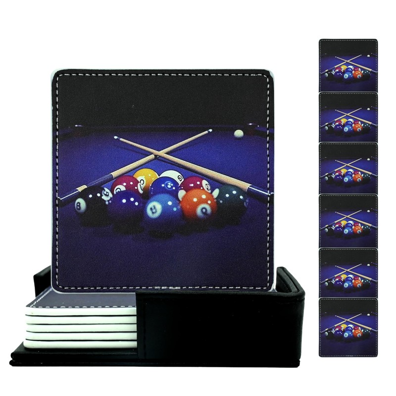 Billiards Coasters Square Leather Drinks Coaster Set with Holder for Coffee Table Bar Home Decor 4 Inches Set of 6