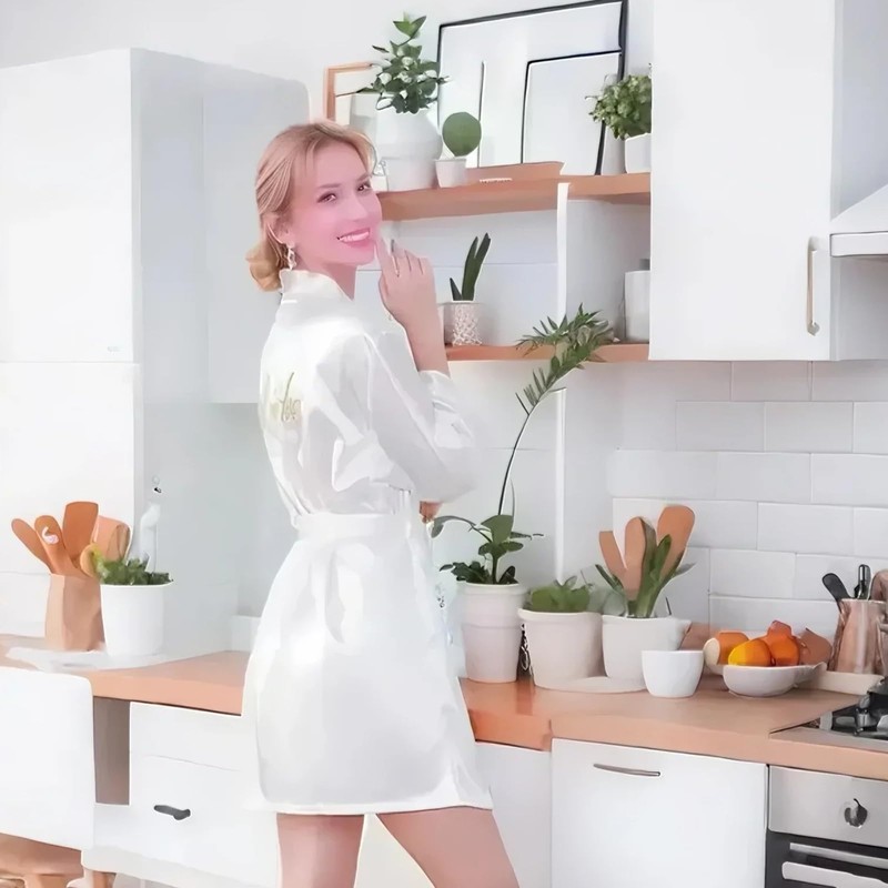 • 3. Exquisite Handwerkskunst: Unsere Brautmorgenkleider haben verstärkte Kanten am Ausschnitt, Anti-Curling-Streifen an den Manschetten und am Saum, einen Gürtel zum Befestigen und einen glitzernden Goldschriftzug auf der Rückseite, der elegant und charmant aussieht.