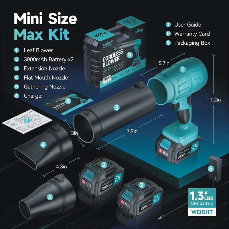 - The Complete Multifunctional Kit: One Billty cordless blower Kit is all you need. Includes: 1 battery powered leaf blower, 2 batteries, 1 charger, 1 extension nozzle, 1 flat mouth nozzle, 1 gathering nozzle, 1 user manual, 1 brand card. Within two years, if you have any problems, please feel free to contact us and we will effectively address your concerns. Ready to welcome your newest indoor-outdoor power tool? Get yours today