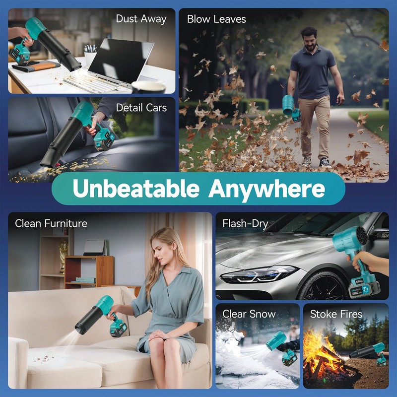 - Unstoppable Air Power: Hit the switch and get ready to be blown away! Its 115 mph wind speed makes quick work of leaves, light snow, dust, debris, and shallow puddles like they're feathers. Whether it's clearing yard leaves, patio dust, workshop sawdust/metal shavings, car messes, furniture dust, or snowy walkways – just squeeze the trigger, dial the wind speed, and get the job done. Effortlessly