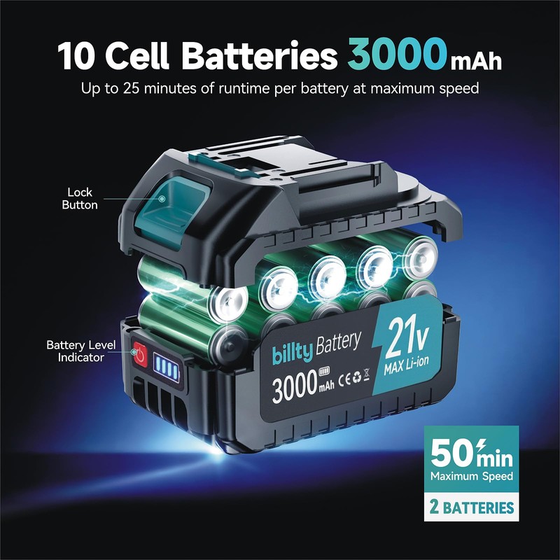 - Peak Power, Long-Lasting Runtime: Leaf piles still standing, but your handheld leaf blower already quit? That’s not Billty's story! Our twin 21V 3000mAh batteries live-monitored by LED gauges sustain 50 minutes of max-power onslaught – conquering whole yards without mid-battle retreats. Backed by battle-tested triple-shield protection (thermal/short-circuit/overcharge). Enough to finish your entire weekend home maintenance session without interruption
