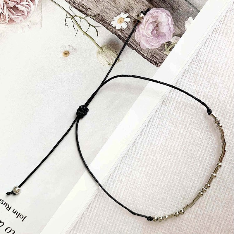 • This unique morse code bracelet is made of black waxed cord and metal beads