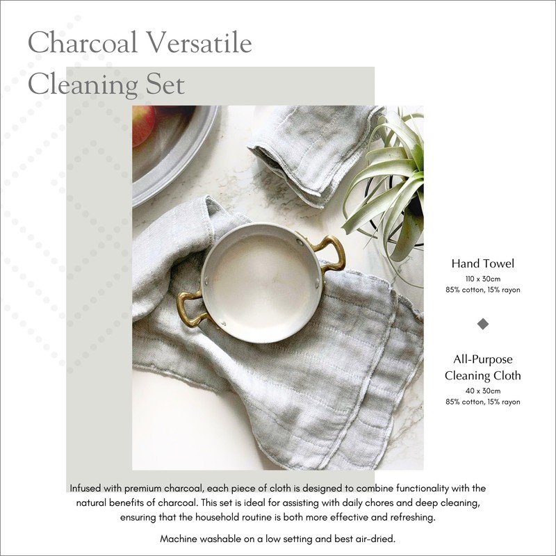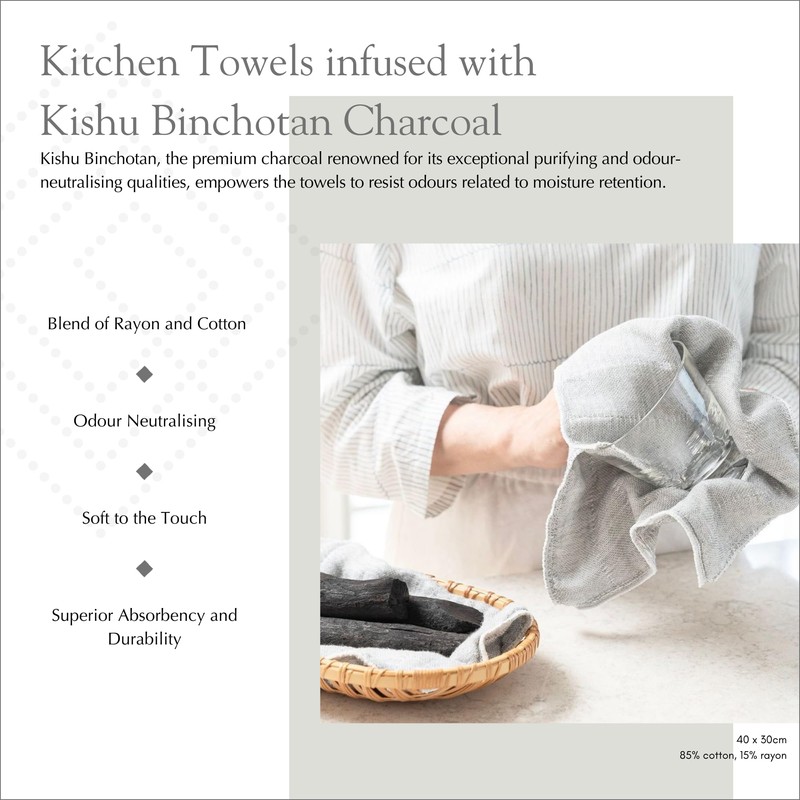 - 🎍 KISHU BINCHOTAN CHARCOAL INFUSION: This set of kitchen towels is infused with Kishu Binchotan charcoal, known for its purifying and odour-neutralising properties. The cloths not only remain fresh but also help keep your kitchen pristine. They are excellent for wiping and drying dishes, as well as cleaning glass surfaces to enhance their clarity and shine.