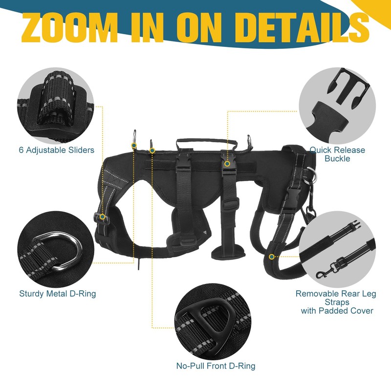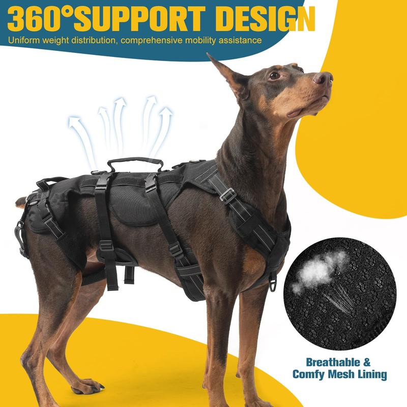 - COMPREHENSIVE DETAIL DESIGN: The dog support harness has 6 adjustable points to achieve a snug fit, as well as highly visible reflective straps for safety. Furthermore, two removable padded leg straps reduce friction when your dog moves
