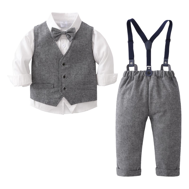 - 4-piece set includes: A stylish shirt set for children with long sleeve shirt, long pants, suspenders, and removable bow tie