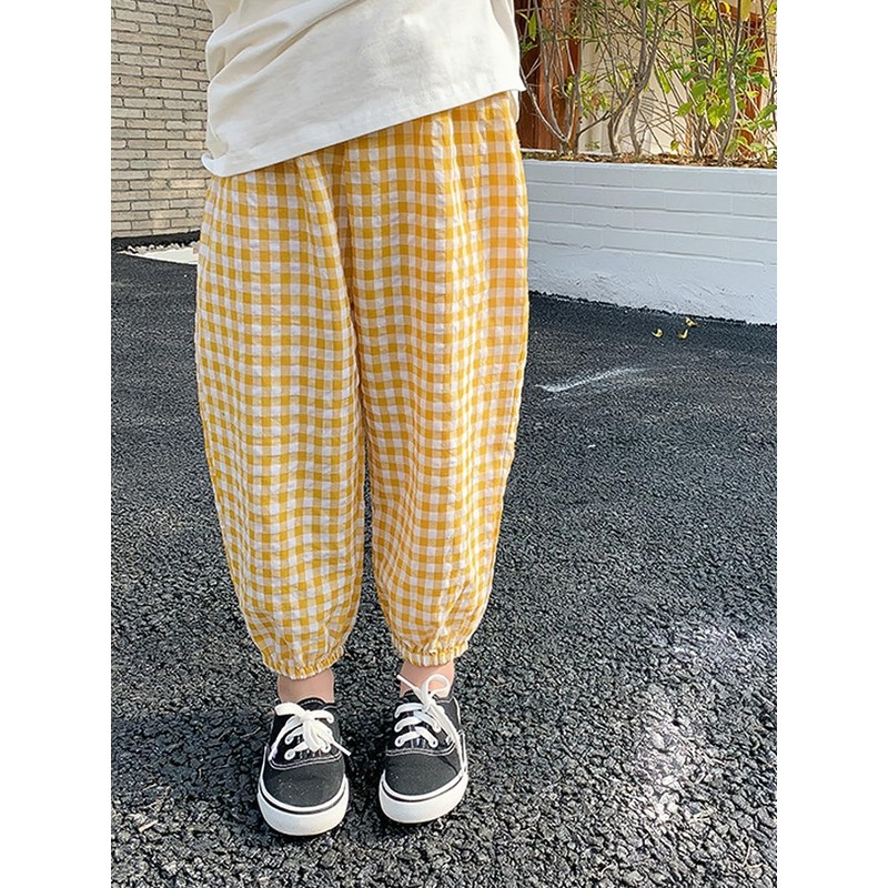 BINIDUCKLING Summer Loose Gingham Girls Pants Size 6-7 Yellow