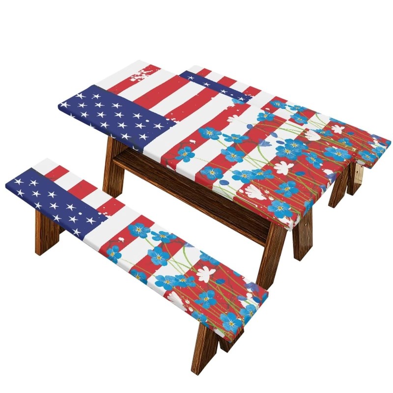 Binienty American Flag Picnic Table Cover with Bench Cover Set Stain Resistant Tablecloth 4th of July USA Flag Flower Tablecloth 3Pcs Set,Independence Day Outdoor Decor,8 Foot