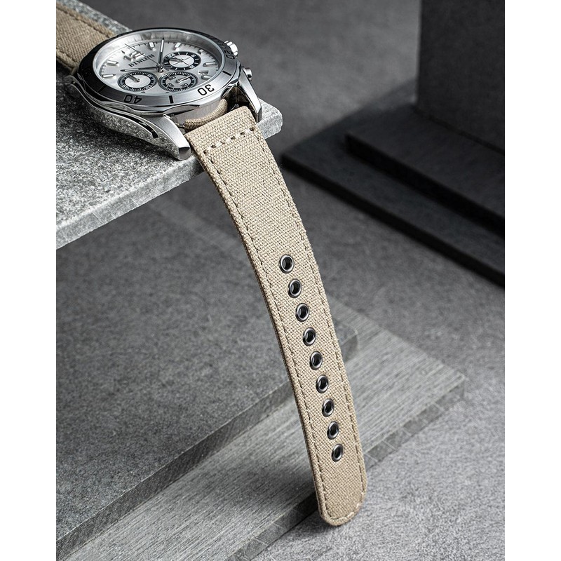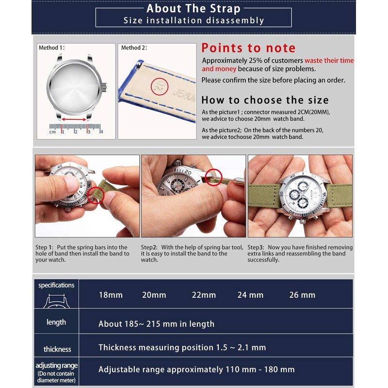- Crafts and Styling- The sailcloth strap is made of high-quality canvas through advanced process and has a beautiful texture. The curvature of the strap fits perfectly with the wrist and is beautiful, soft. The strap body has 3 buckles and the buttonhole is fixed with stainless steel ring, which is increasing durability and maintaining attractive appearance