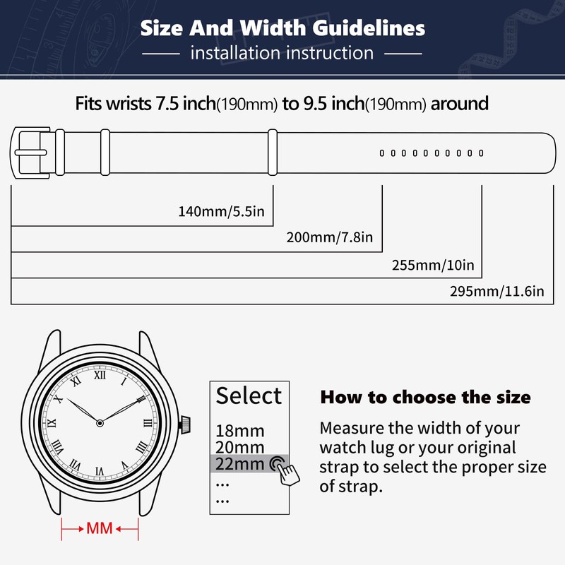 - 【Optimal Length】 Our one-piece leather watchband measures about 11.6” (295mm) from buckle to tip with 11 holes that are adjustable for wrist from 7.5” to 9.6” in circumference. If the strap is longer than desired, you can fold excess length back under the keeper loops for a casual look.