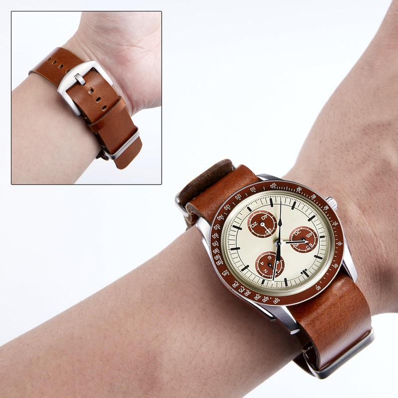 - 【Premium Material】Made of high quality crazy-horse oil-tanned leather, which is soft, retro, durable and skin-friendly; brushed stainless-steel buckle and 3 matching keeper loops that hold your watch securely on your wrist.