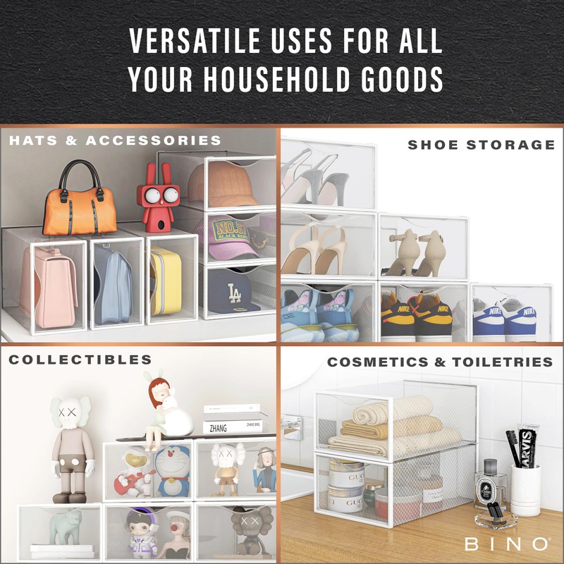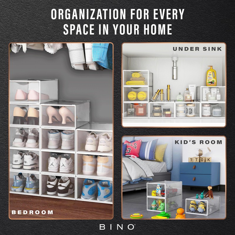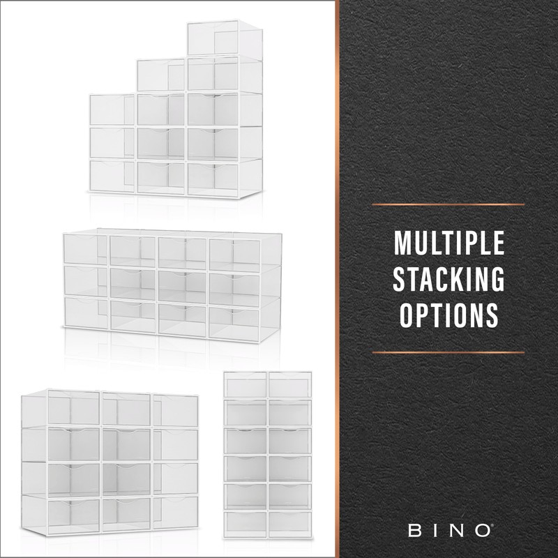 BINO 12-Pack Plastic Stackable Shoe Box Set - Clear | Foldable Shoe Storage Container | Sneaker Bins | Shoe Rack Box | Transparent | Portable Stacking Shoe Boxes Front Open
