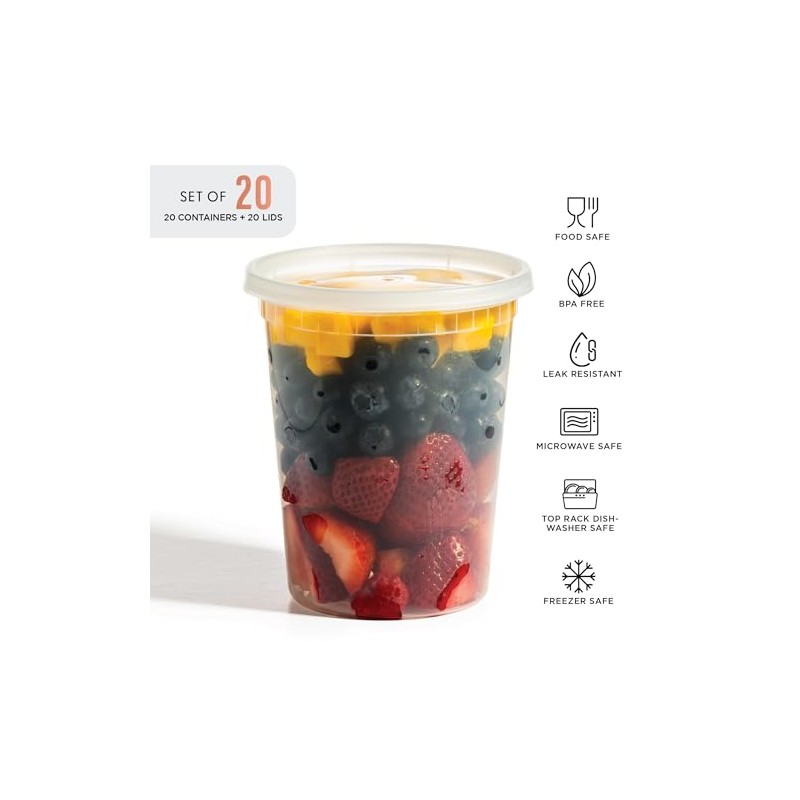 BINO | 32 Oz Deli Containers with Lids - 20 Pack | Food Storage Containers with lids | Freezer Safe, Microwaveable Plastic Containers with Lids for Meal Prep, Leftovers, Soups, Salads Takeout Catering