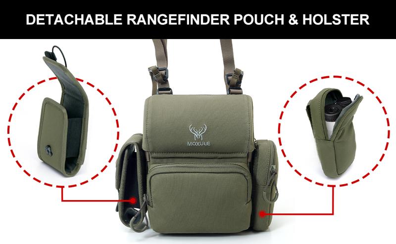 - Portable Multi Pockets: 1 main large compartment with 2 little mesh storage,2 detachment velcro holster and rangefinder pouches,1 front phone pocket,1 layer mesh space,1 rain cover pocket;The bottom of the binocular harness chest pack is equipped with molle straps.