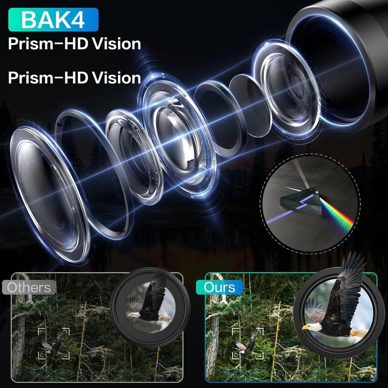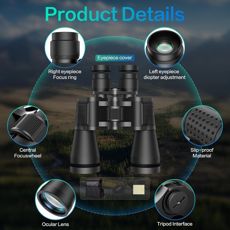 • 【PORTABLE, COMPACT AND SMALL BINOCULARS DESIGN】 One hand can be mastered when you use the birding binoculars for opera,bird watching camping, traveling,wildlife watching,football games,cruise or other outside activity, the low light night vision goggles(Not for completely dark night) is more convenient for using and carrying.Central focusing wheel, smooth to help you get faster and more accurate objects.