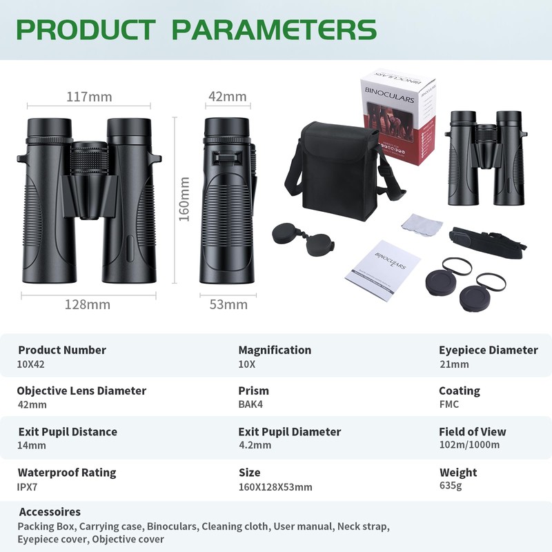 - 【10x42 High-definition Binoculars】The adult binoculars is equipped with a 42MM ultra large objective lens and a 10x magnification design, featuring high-definition anti distortion performance. Its field of view can reach 305ft/1000yds, providing clearer images and longer distances beyond 1000yds, which is suitable for bird watching, hunting, watching sports events, traveling and more.