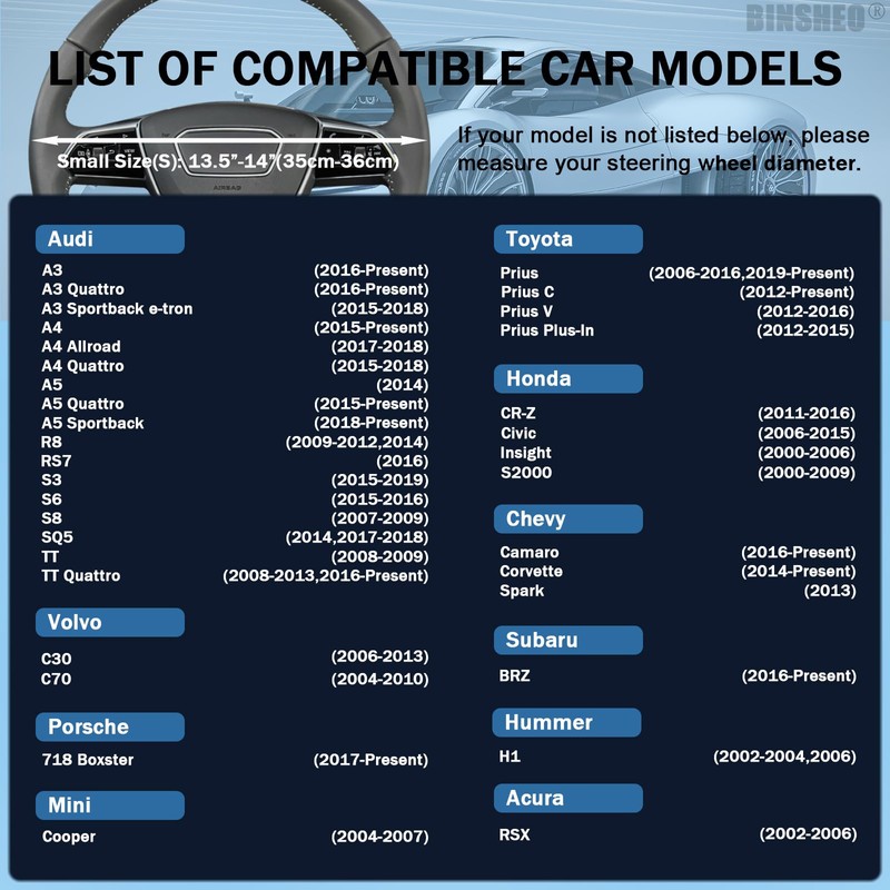- [Applicable] - Fits all small steering wheels from 13.5 inches to 14 inches (36 cm) in diameter, including car steering wheel covers (Prius, Civic, S, etc.), boat steering wheel covers, golf cart steering wheel covers (Club Car and Yamaha, etc.). Measure your steering wheel size carefully before purchasing please.