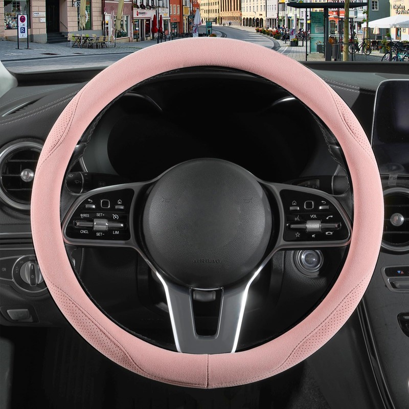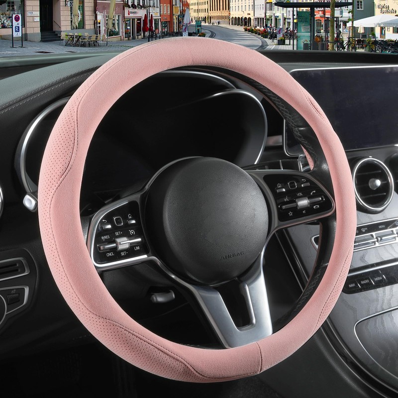 Binsheo 14 inch Pink Suede Steering Wheel Cover, Breathable Non-Slip Sweat-Proof Wear-Resistant No Pilling, Warm in Winter and Cool in Summer
